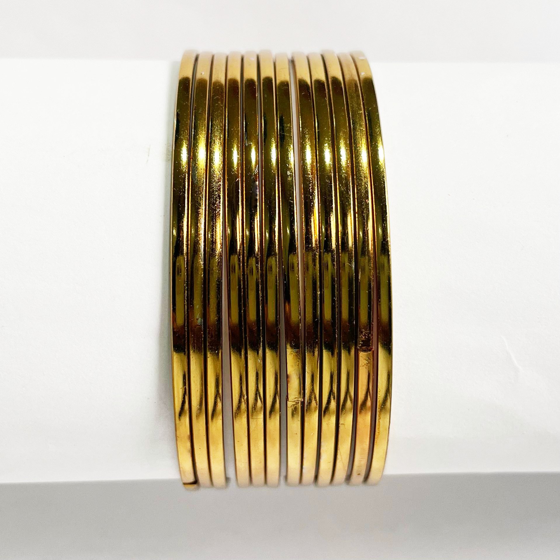 These Plain Shining Mehndi Bangles bring a traditional yet trendy touch to everyday wear. Finished in a smooth mehndi-tone coating over sturdy alloy metal, these bangles offer a rich look while remaining lightweight and comfortable for long use.