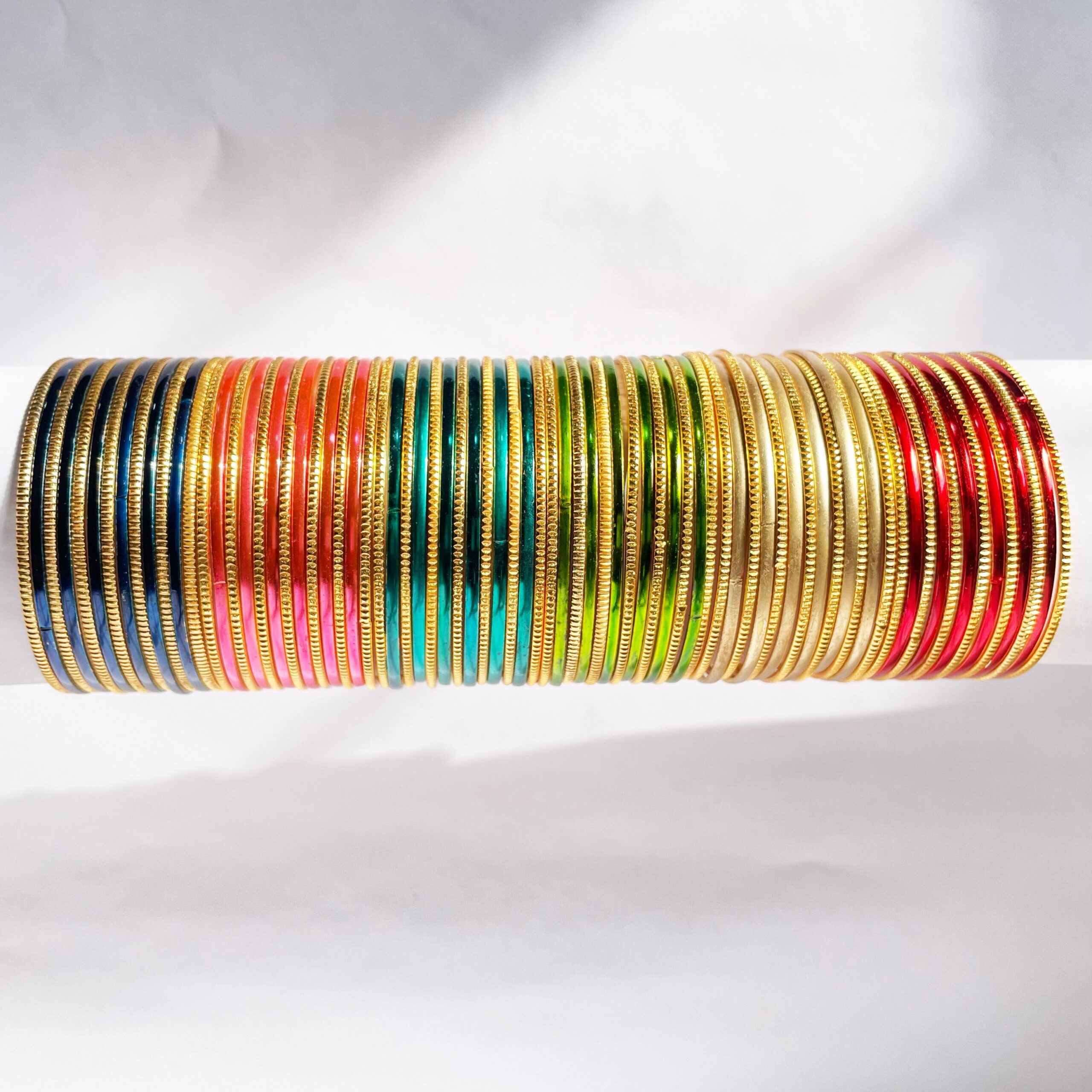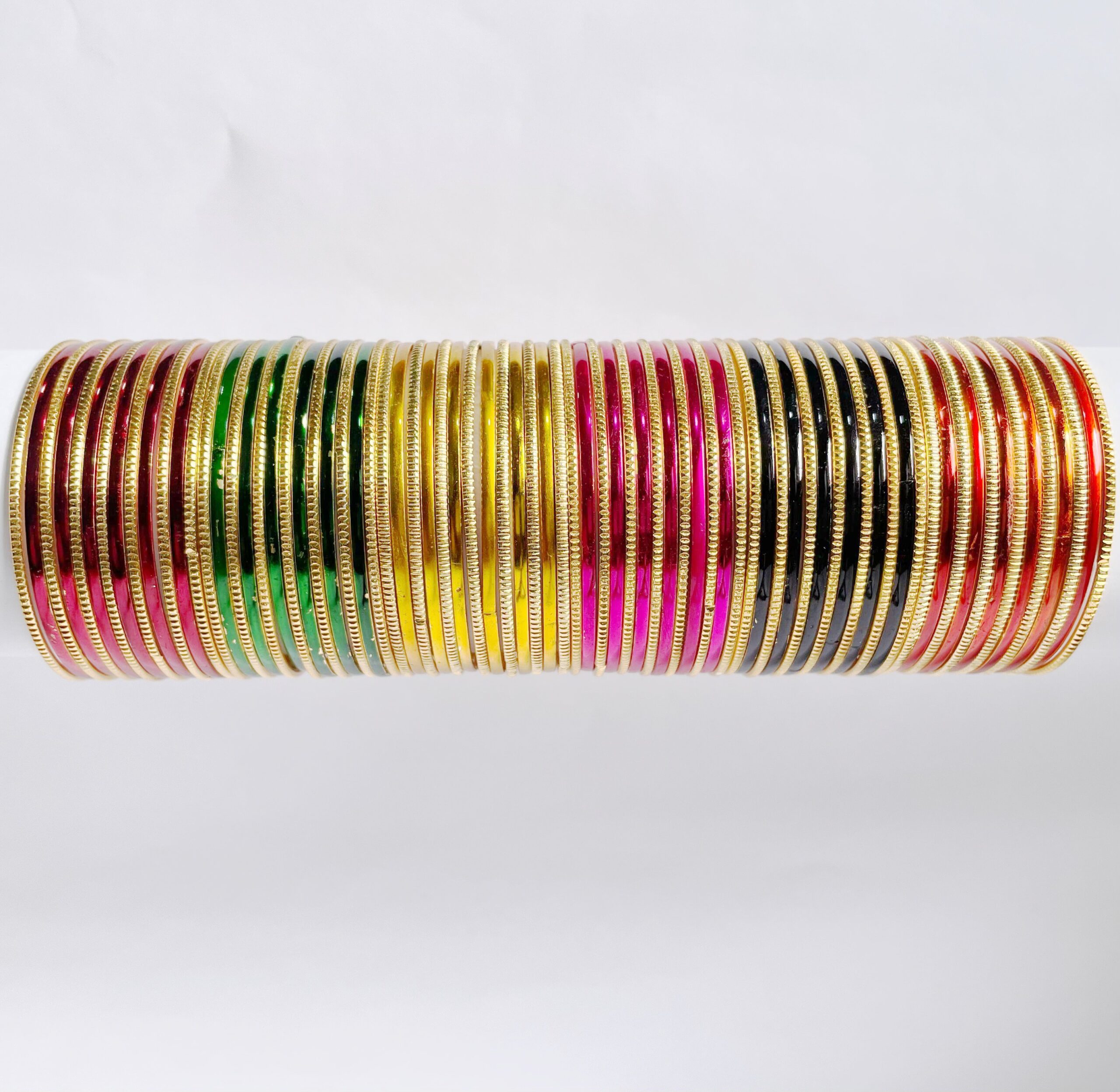 Bring elegance and variety to your collection with this 13-piece set of Colour and Knurling Gold Plated Bangles, crafted for everyday use and high-volume resale. Made from durable alloy metal with a smooth gold finish, this combination of plain, colourful, and textured bangles caters to both traditional and modern tastes.